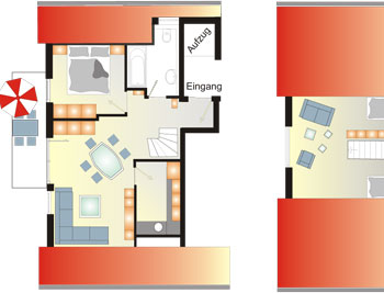 Die Ferienwohnung ist für 2-5 Personen geeignet und liegt im 2. und 3. OG eines Mehrfamilienhauses. Wie sie den Grundrissen entnehmen können, gibt es auf der ersten Etage ein Schlafzimmer, ein geräumiges Wohn-/Esszimmer, eine voll ausgestattete abschließbare Küche sowie ein Bad mit WC. Über eine innenliegende Treppe gelangen Sie ins Studio im Dachgeschoss. Hier finden Sie zwei Einzelbetten sowie eine ausziehbare Schlafcouch.